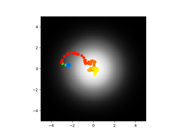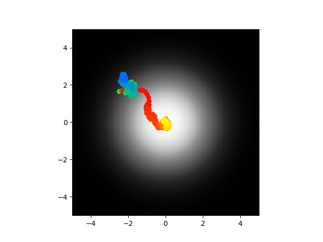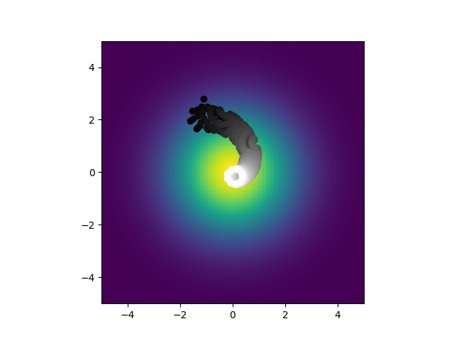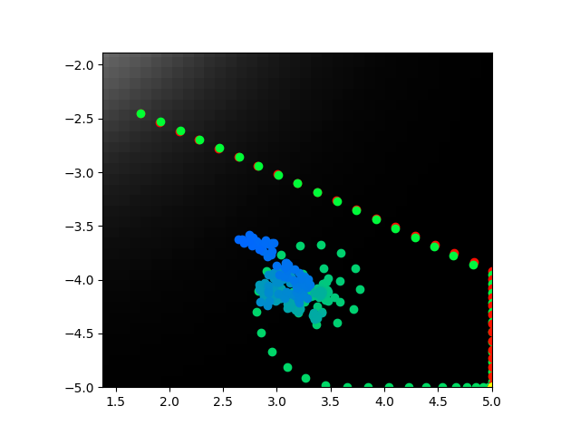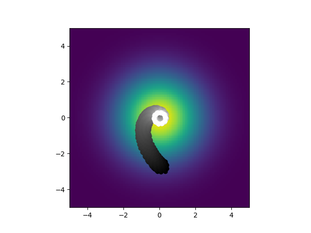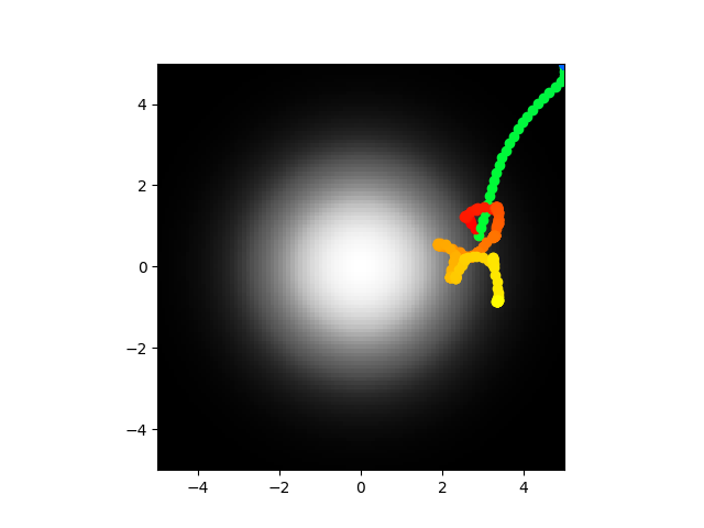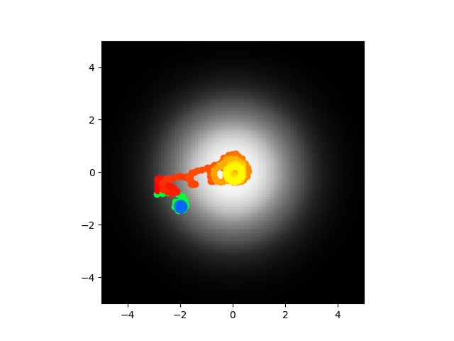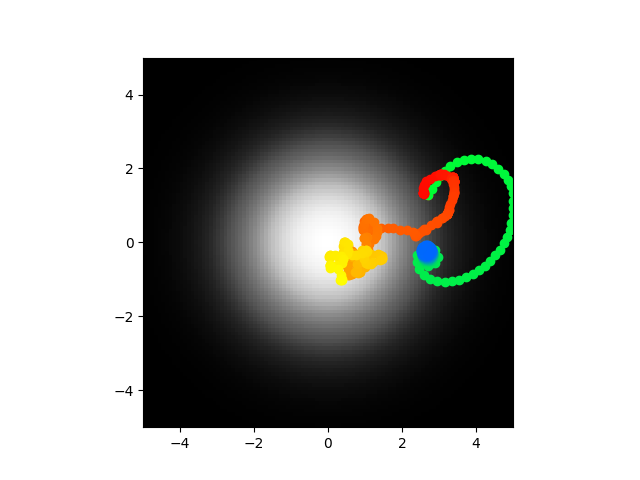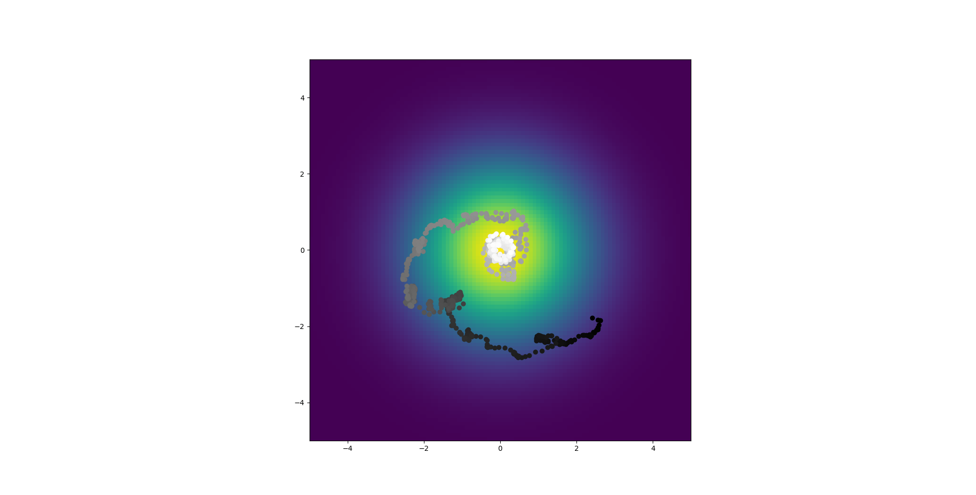 So what are you looking at? There is a gradient in the center that the worm is meant to seek. Points are also plotted for the worm's position. The darker a point the earlier it is in the simulation, the lighter, the later. So a white point is where the worm ended up, in this case after 15 simulated minutes. This was simulated with the neuron model given in the paper and random parameters for it. As you can see, not really great at center seeking. Not a huge surprise. What is surprising is this: