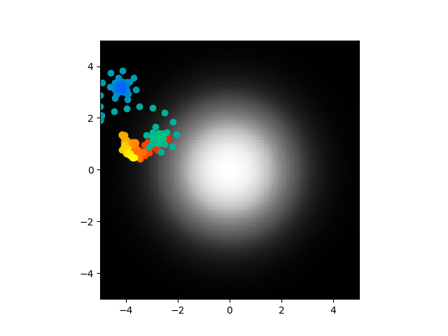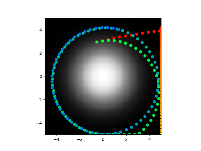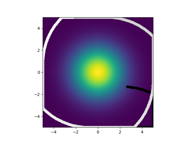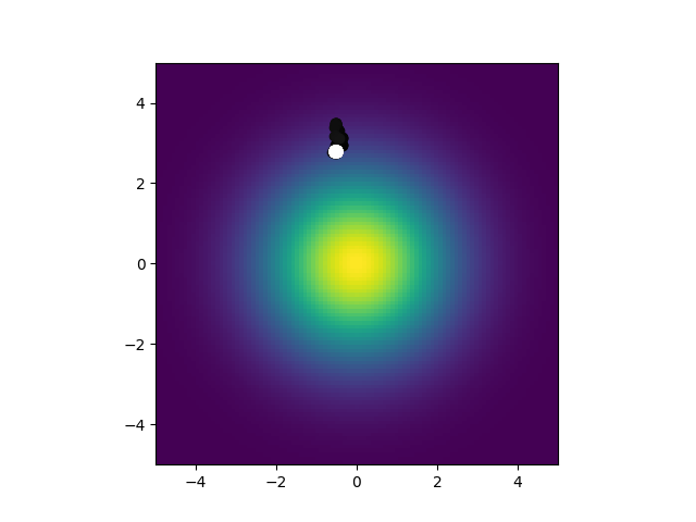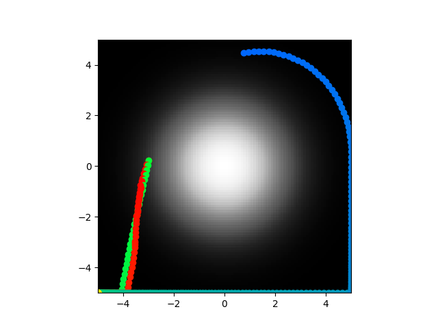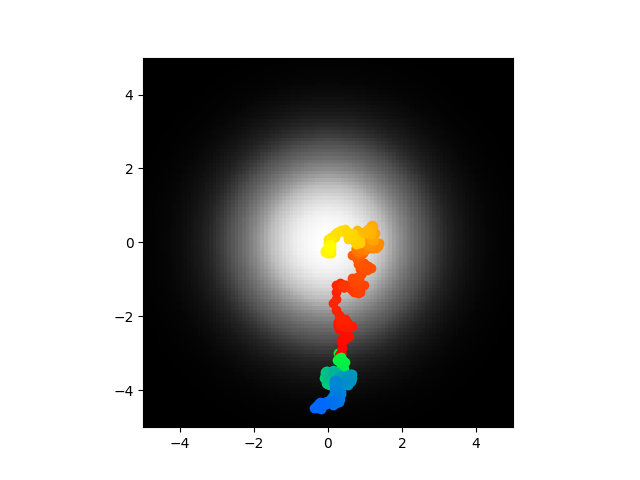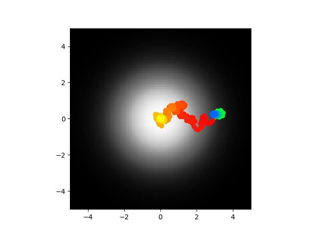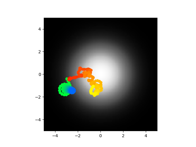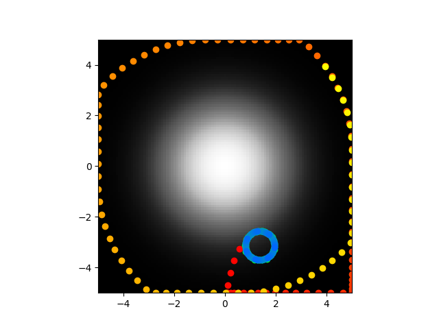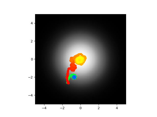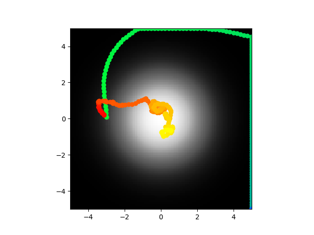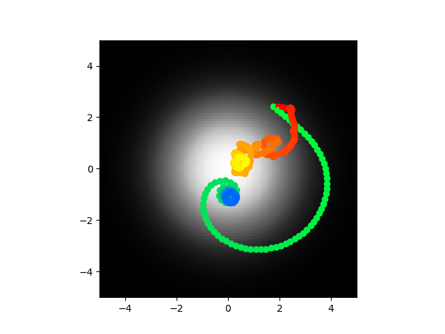 So what are you looking at? There is a gradient in the center that the worm is meant to seek. Points are also plotted for the worm's position. The darker a point the earlier it is in the simulation, the lighter, the later. So a white point is where the worm ended up, in this case after 15 simulated minutes. This was simulated with the neuron model given in the paper and random parameters for it. As you can see, not really great at center seeking. Not a huge surprise. What is surprising is this:
