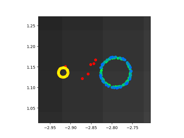 So the gradient is now grayscale, the abstract/analytical/time derivative based model (from here on out, the model based on equation 25 will be referred to as the abstract model and the model based on the voltages of explicitly simulated neurons will be the direct model) shows position with color that starts as red points and ends as yellow, the direct model goes from green to blue but it stayed essentially still. As you can see, disagreement still abounds. The code also shows the synaptic weights and the voltage over time but those aren't really relevant in this case. Code is pushed here. To be clear, these should perfectly overlap, or at leas be pretty close, that is not what is occurring.